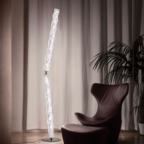Le lampadaire Cabildo est doté d’un surprenant diffuseur englobant la source lumineuse DEL et diffuse comme par magie un halo lumineux indirect, flottant entre sol et plafond.