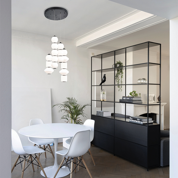Dango est une mini suspension unique en son genre, composée d’une suite de verres opalins géométriques disposés à la verticale. Elle convient parfaitement au-dessus d’un îlot de cuisine, autour d’un miroir de salle de bain ou encore de chaque côté d’un lit dans l’espace chambre à coucher. Il est possible de créer des compositions multiples grâce aux choix de tailles et finis qui sont offerts : de petit à très grand, en fini noir, rose ou or, les combinaisons sont très nombreuses.