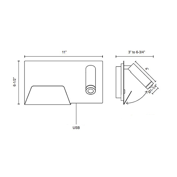 Dorchester est une lampe murale de chevet constituée d’une plaque rétroéclairée et d’un spot DEL orientable de forme cylindrique muni d’une lentille en verre optique au bout. Le retro éclairage qui sert de lumière d’ambiance possède son propre interrupteur, tout comme le spot qui offre une lumière plus dirigée. La plaque large mesure 11” x 6.5” , elle est muni d’une prise de recharge USB ainsi qu’un porte téléphone cellulaire pour plus de polyvalence ou pour tout simplement libérer de l’espace sur votre table de chevet.