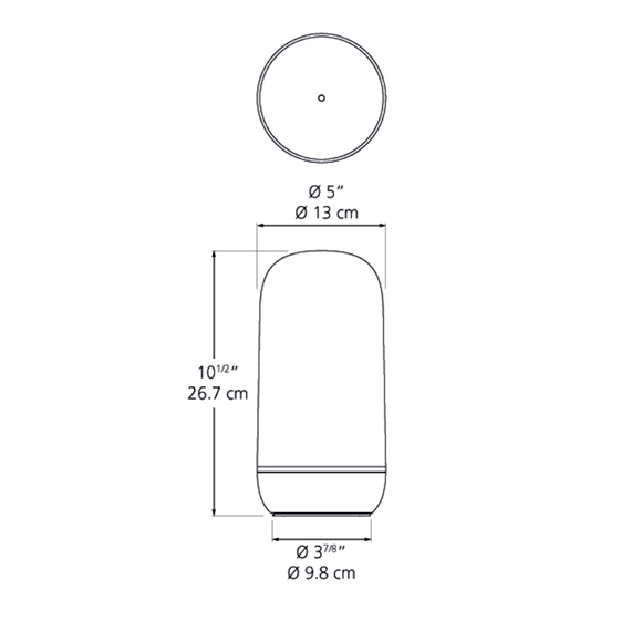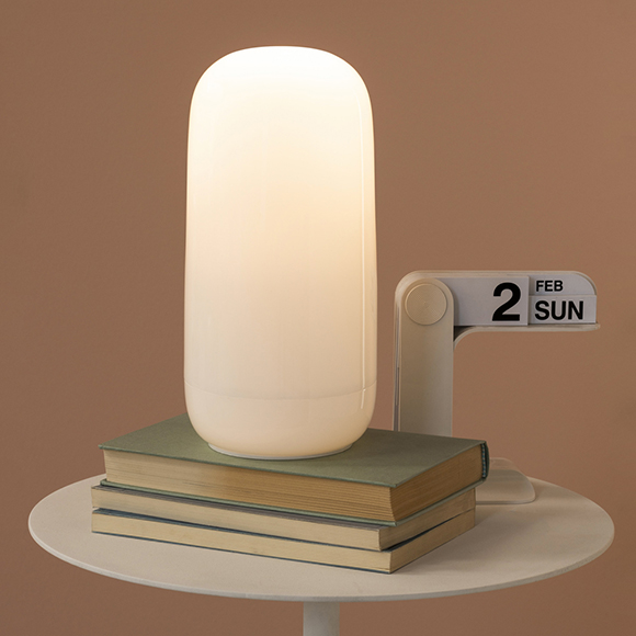 Gople devient désormais une lampe portable qui offre un temps de fonctionnement de 26 heures sans être branchée. Le diffuseur en PMMA laisse apparaître un léger dégradé, un rappel de la finition de la version d’origine. À l’intérieur de la lampe portable on peut y apercevoir la source de lumière DEL et la batterie rechargeable.
