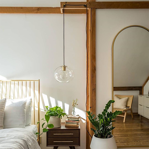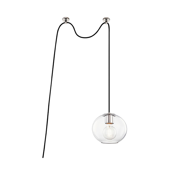 Margot est une suspension simple et discrète qui dégage une ambiance apaisante. Pouvant être branchée directement à une prise, Margot convient au-dessus d’une table, d’un coin lecture ou encore près de vos tables de chevet. Des accents métalliques au niveau de la douille, du capuchon de l’abat-jour et du bras ajoutent son l’effet apaisant. Le fond ouvert et le verre transparent de l’abat-jour permettent à un maximum de lumière de circuler, faisant de ce luminaire un choix idéal partout où une lumière vive est nécessaire.