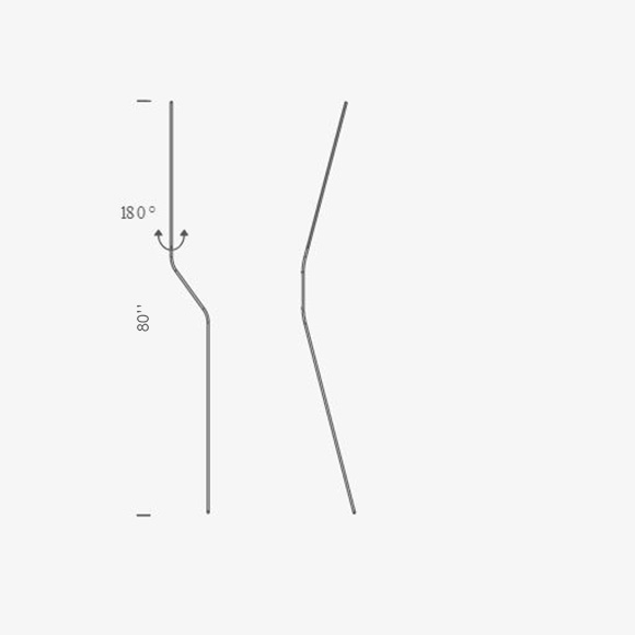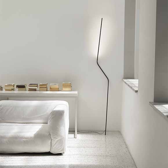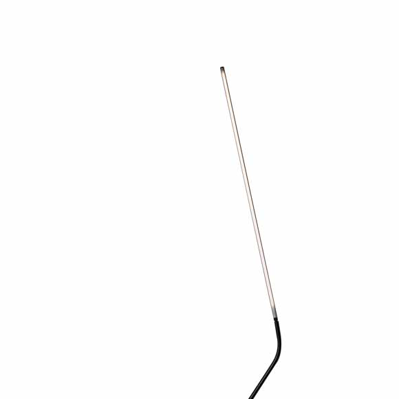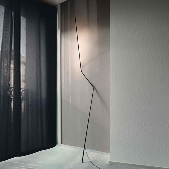 Neo est une lampe de sol DEL en appui sur le mur, sa structure en acier cintré et corps lumineux en aluminium peint noir mat se termine par une tète pivotante pour éclairage indirect.
