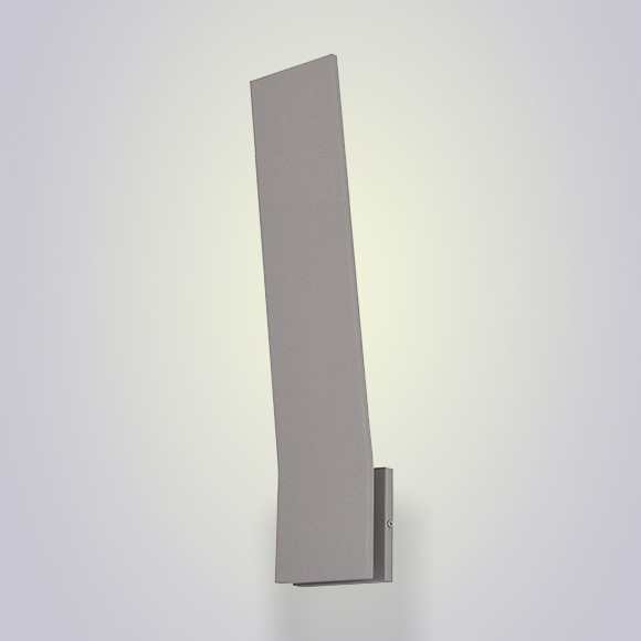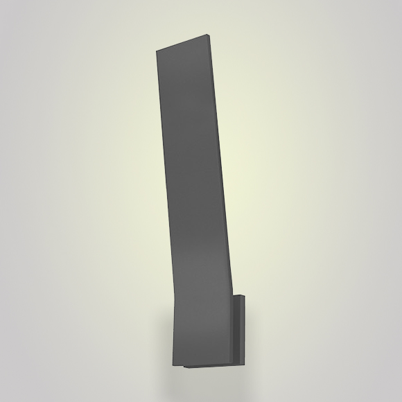 Nevis, murale extérieure DEL en aluminium de forme rectangulaire, légèrement pliée à partir du bas pour donner un effet de relief et mettre en valeur l’éclairage DEL dissimulé à l’arrière qui offre un éclairage indirecte, orienté vers le mur. La Nevis est disponible en deux tailles et deux couleurs différentes : graphite et gris clair.