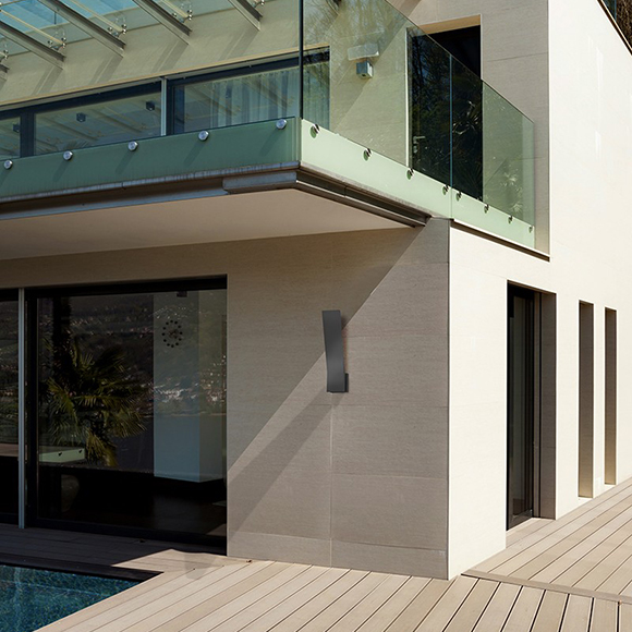 De style architectural contemporain, cette applique murale est conçue pour convenir à un environnement extérieur mais peut tout aussi bien être installée dans les espaces intérieurs.