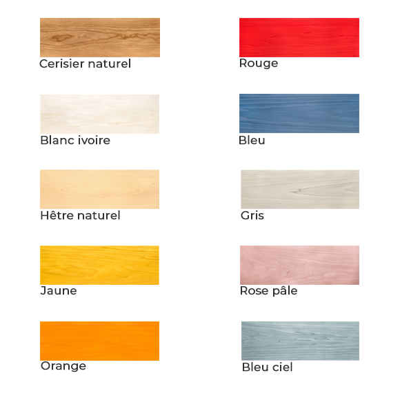 - Disponible en 10 couleur * : Cerisier, hêtre naturel, blanc ivoire, orange, rouge, jaune, bleu, gris, rose pale et bleu ciel