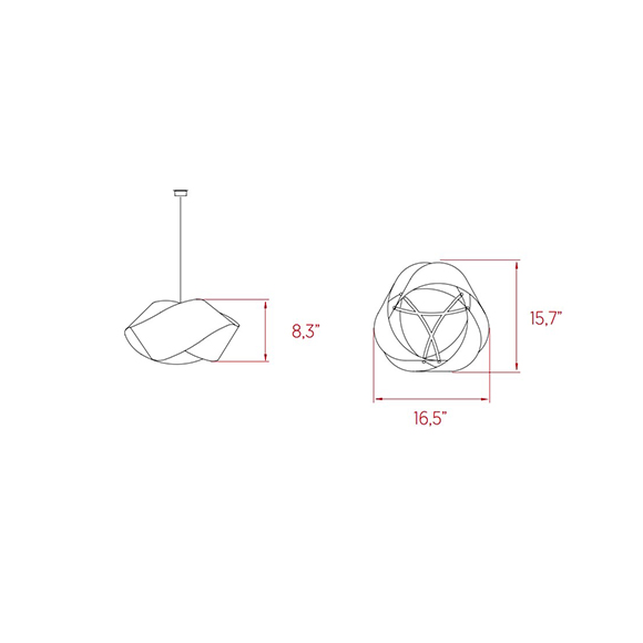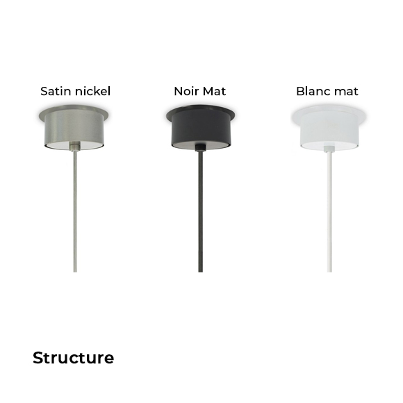 - Structure de suspension disponible en blanc mat avec fil blanc, satin nickel avec fil transparent ou noir mat avec fil noir