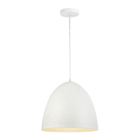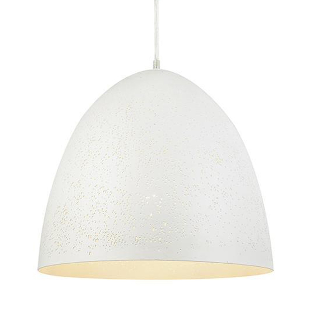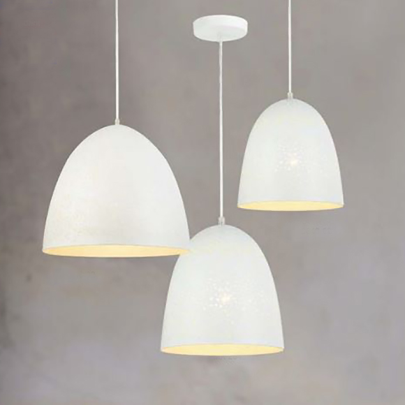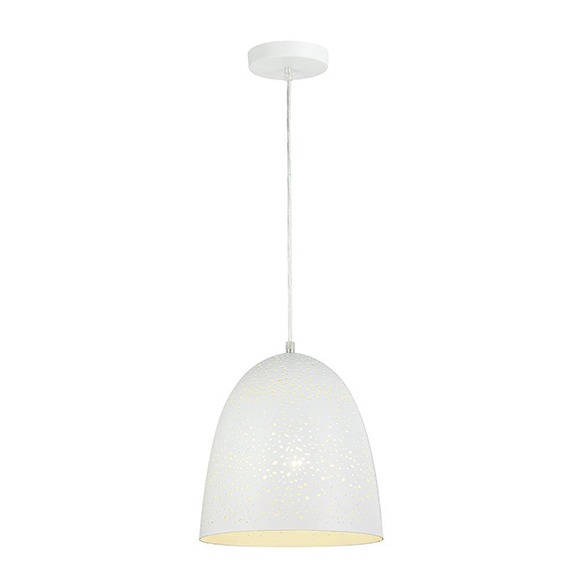 Pixie est un luminaire suspendu en métal perforé, disponible en fini blanc et trois tailles, il est fourni avec 8 pieds de fil.